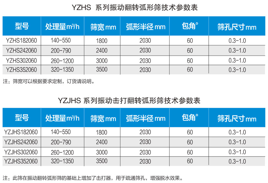 YZ(J)HS系列振動(dòng)(擊打)翻轉弧形篩是煤炭工業(yè)使用的一種細粒級物料脫介、脫水分級設備。按給料方式不同可以分為自流弧形篩和壓力弧形篩:按設備特點(diǎn)可分為固定弧形篩、可翻轉弧形篩、振動(dòng)翻轉弧形篩、擊打式翻轉弧形篩和振動(dòng)擊打式翻轉弧形篩等;⌒魏Y僅做初步脫水,脫介設備必須與其他設備如煤泥離心機、篩分機等配合使用。