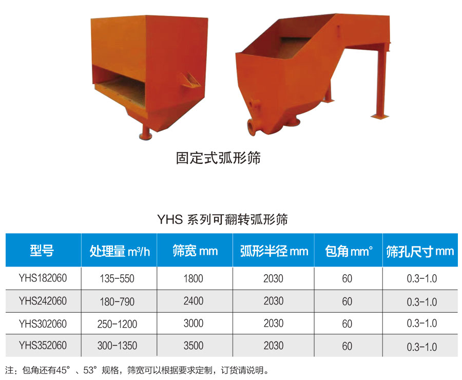 YHS系列可翻轉弧形篩是煤炭工業(yè)使用的一種細粒級物料脫介、脫水分級設備。按給料方式不同可以分為自流弧形篩和壓力弧形篩:按設備特點(diǎn)可分為固定弧形篩、可翻轉弧形篩、振動(dòng)翻轉弧形篩、擊打式翻轉弧形篩和振動(dòng)擊打式翻轉弧形篩等,目前國內常用的是自流式YHS系列可翻轉弧形篩,即可通過(guò)翻轉調向改進(jìn)使用效果;⌒魏Y僅做初步脫水,脫介設備,必須與其他設備如篩分機配合使用。